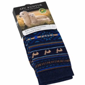 Vi presenterar härmed våra nya strumpor i babyalpackaull, Jacquard, som har ett livligt mönster. Vackra matchade färger har samlats för att skapa ett genomarbetat jacquardstickmönster. Mönstret ser diskret ut trots sin mängd olika färger. En gummerad liten ribbstickad linning ger ett säkert grepp. Dessa vackra kvalitetsstrumpor finns i en fiberblandning av 95% naturlig fiber! Det är fin babyalpackaull som tillsammans med långfibrig prima bomull skapar hållbarhet och styrka. Strumpan är tätt stickad för hög motståndskraft. Så vackert kan naturligt mode vara! Finaste garn från mycket högt naturligt fiberinnehåll vävda till vackra och robusta strumpor.